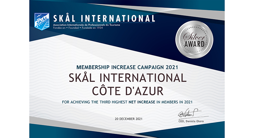 A l’issue de l’Assemblée Générale mondiale du Skal, et pour la 3ème année consécutive, notre club a été récompensé par le Silver Award pour l’importante progression de ses membres : +51 en 2021.